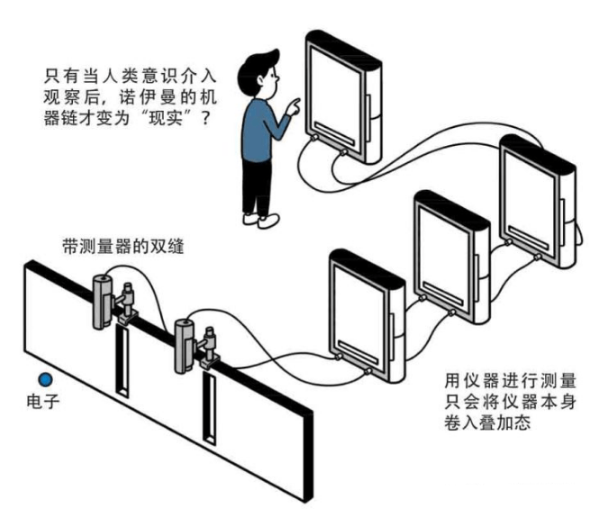 冯·诺依曼就进行了一套逻辑推理,具体的推理如下:首先,观测仪器本身就是由不确定性的粒子构成的。因此,观测仪器本身也拥有波函数。如果用仪器去观测电子的状态,仪器本身也就会卷入到“叠加态”中。如果用无限多个仪器去观测电子的状态,这就意味着第一台仪器观测着电子,第一台仪器和电子都处于叠加态,然后第二台观测第一台仪器,它们也同时处于叠加态,第三台仪器观测第二台仪器,也是如此,一直无限复归下去,那么整个系统就不会发生波函数坍缩,这就是冯·诺依曼的无限复归链。