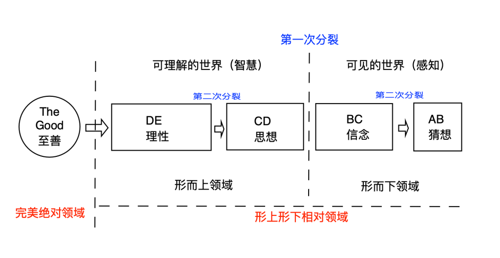 在柏拉图的哲学思想体系中,我们的宇宙,包括我们的智慧,都是从“至善”经历两次分裂之后的产物。从“至善”经历第一次分裂形成了代表可理解世界CE,也称智慧世界,与代表可见世界的AC,也称可感知世界。在第二次分裂之后,代表可见世界的AC,形成了表示“真实事物”的BC,及代表其反射阴影的AB;代表可理解世界的CE,又分裂为了代表“整体形式”的部分DE,及代表其反射阴影的CD。
