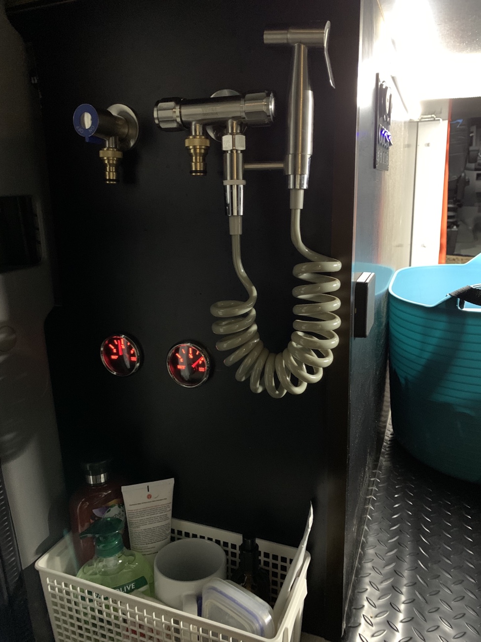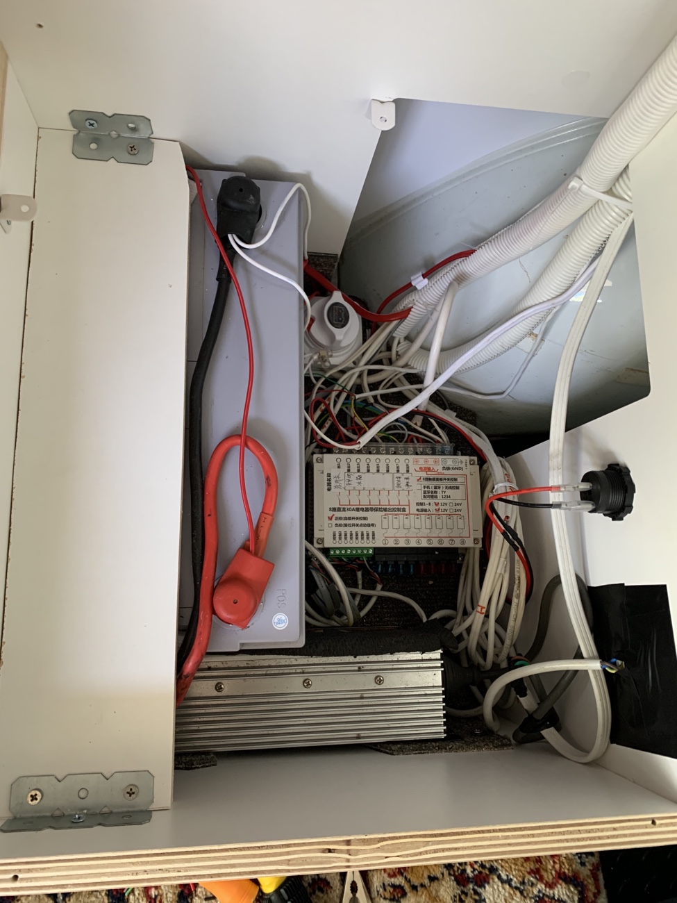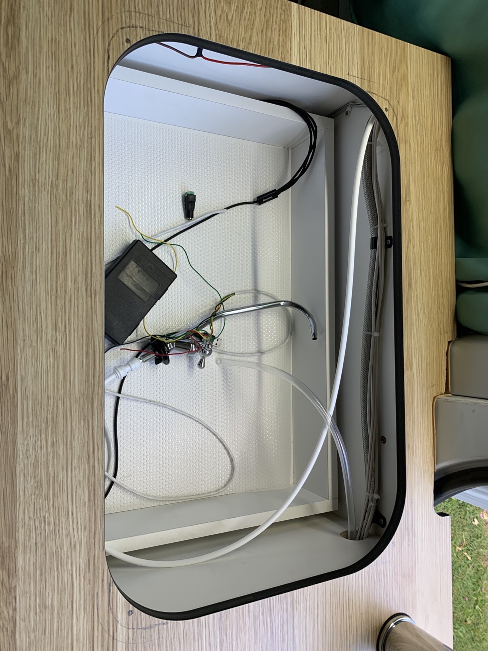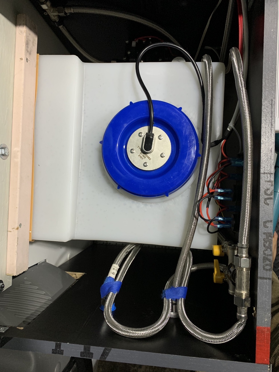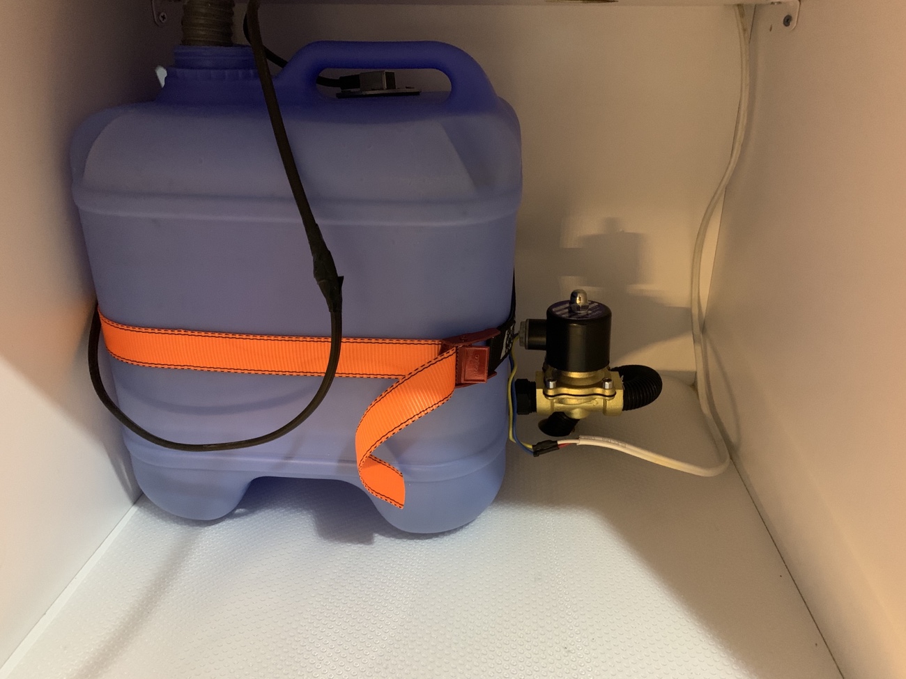 污水箱本来想安装在车子底盘下面,一直没有找到合适底盘的异形箱体,于是采用当地15L标准水箱,牺牲部分车内空间,但是为了方便排水,增加了污水水位传感器以及电磁阀门,当水快满时,在合适的地方,打开主仪表盘的电磁阀门电控开关,即可通过重力自动将污水经由车底盘管路排出。