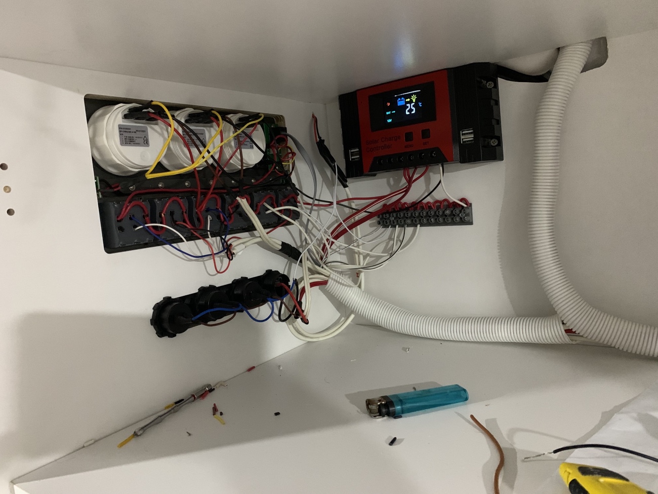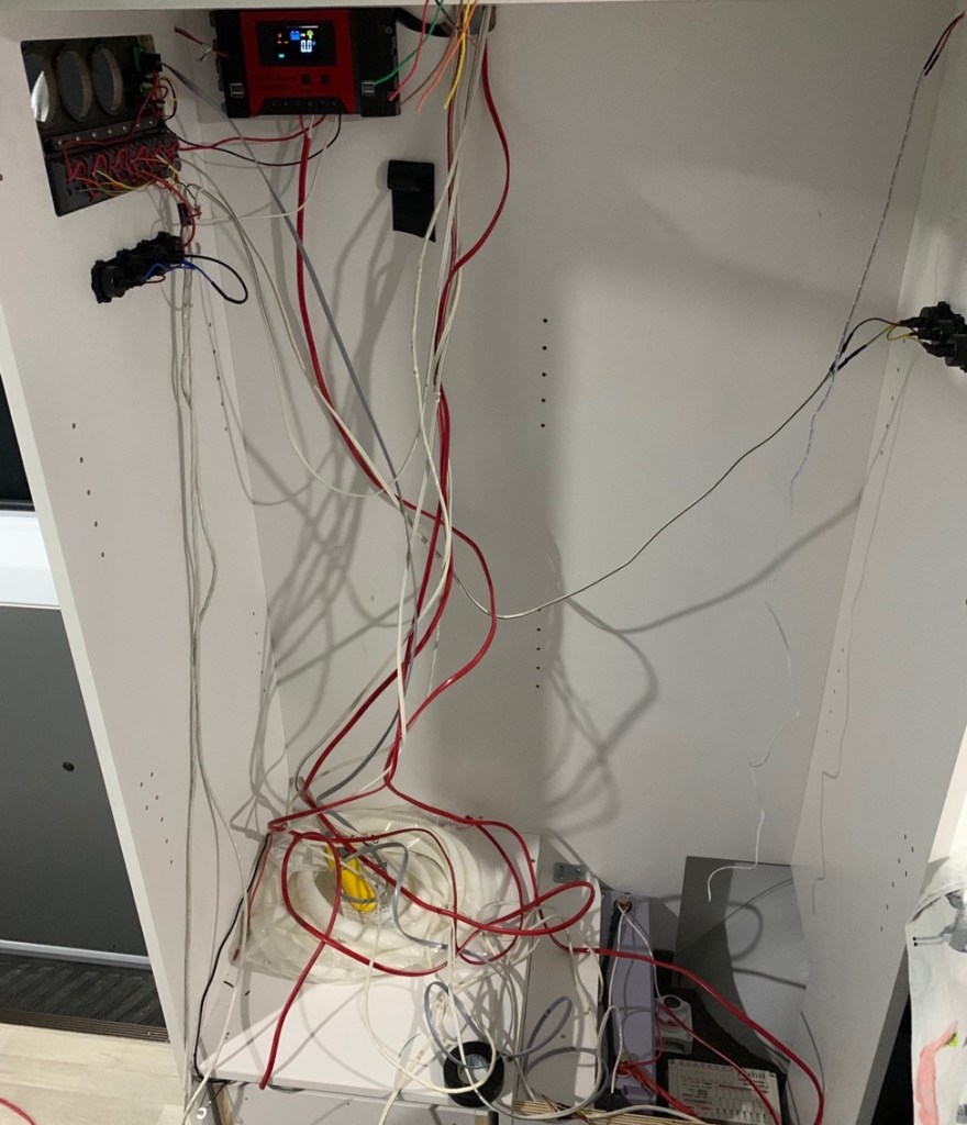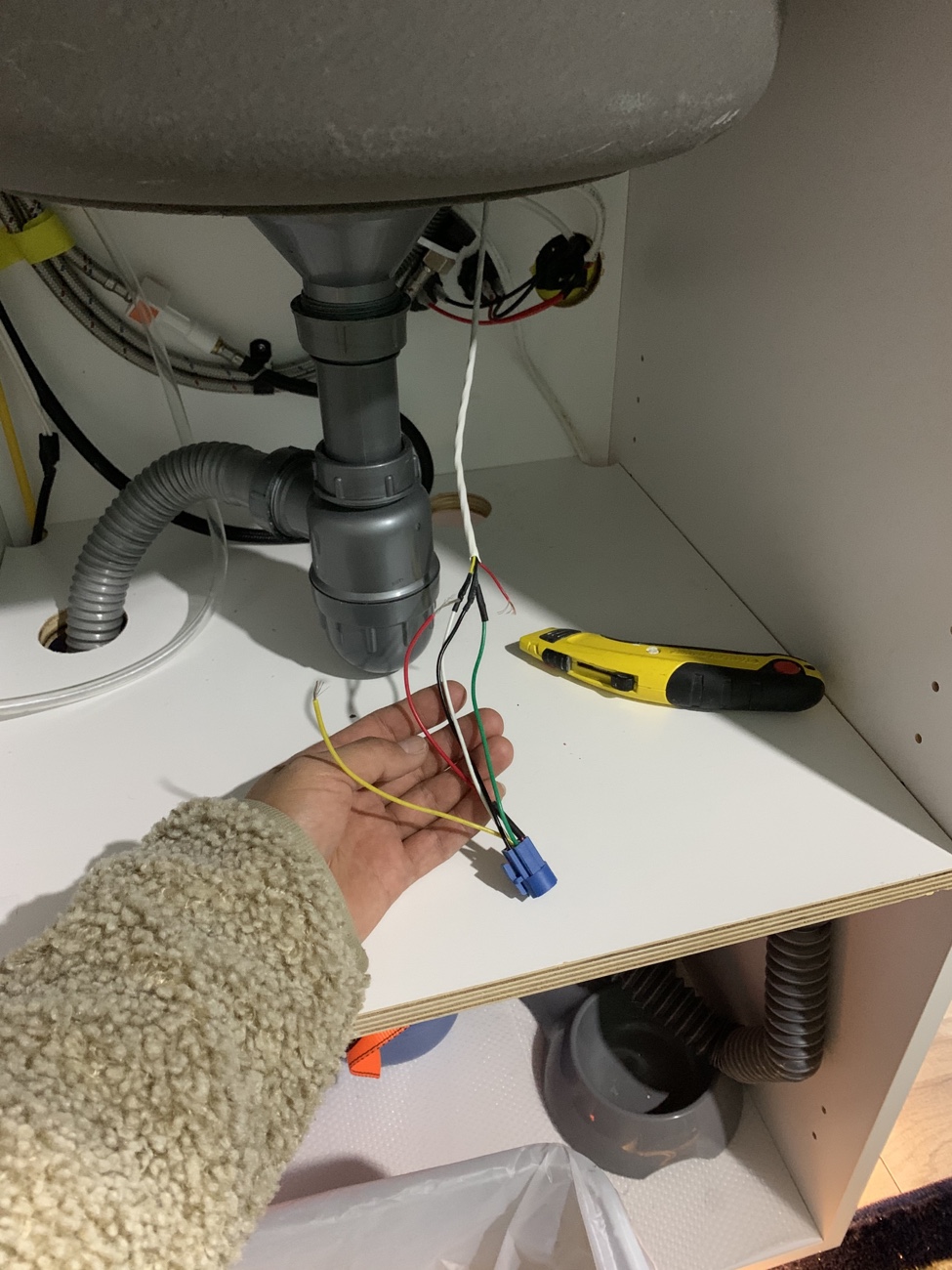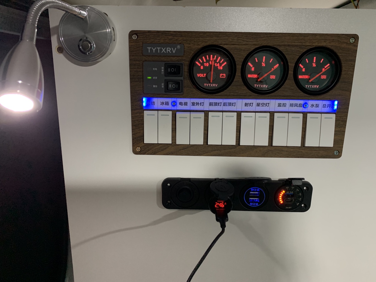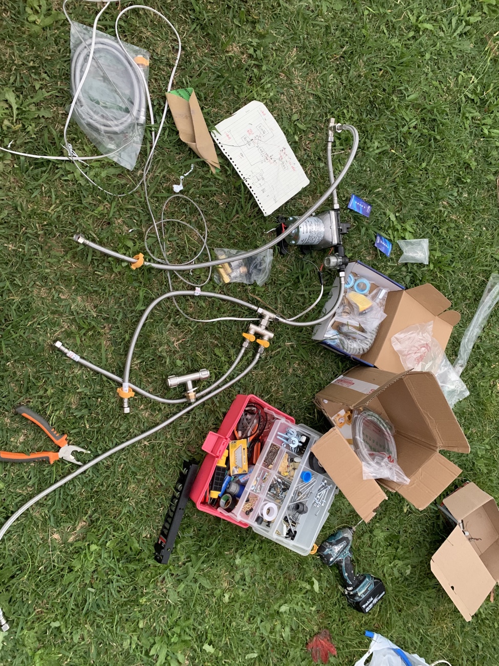 污水箱本来想安装在车子底盘下面,一直没有找到合适底盘的异形箱体,于是采用当地15L标准水箱,牺牲部分车内空间,但是为了方便排水,增加了污水水位传感器以及电磁阀门,当水快满时,在合适的地方,打开主仪表盘的电磁阀门电控开关,即可通过重力自动将污水经由车底盘管路排出。