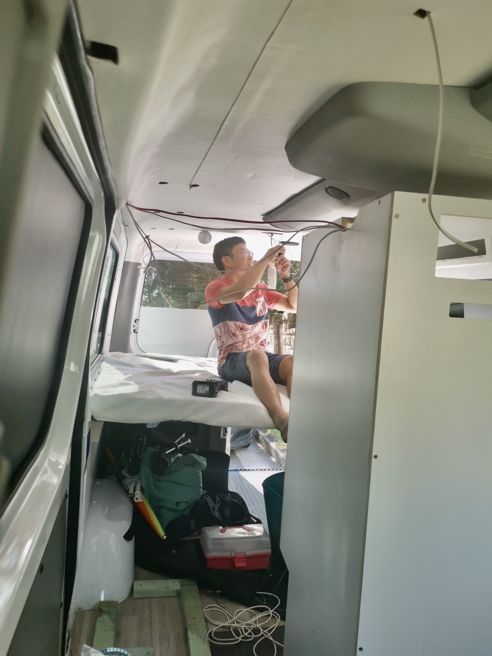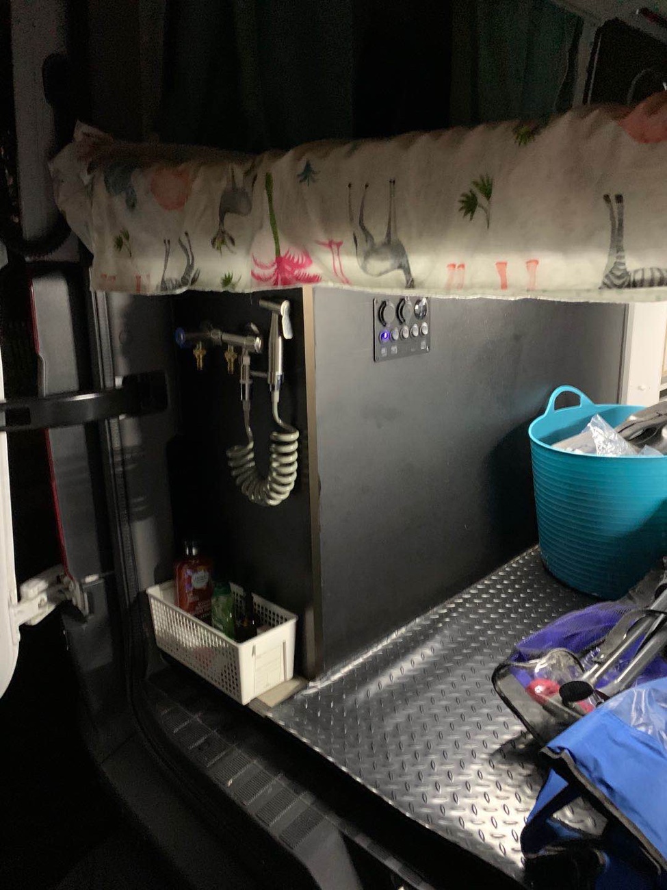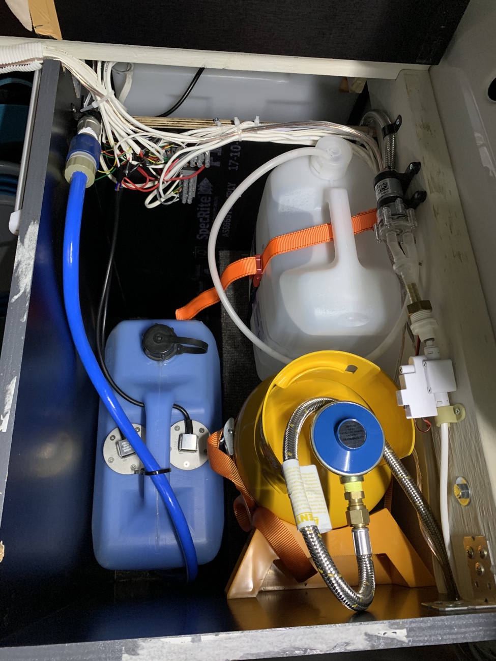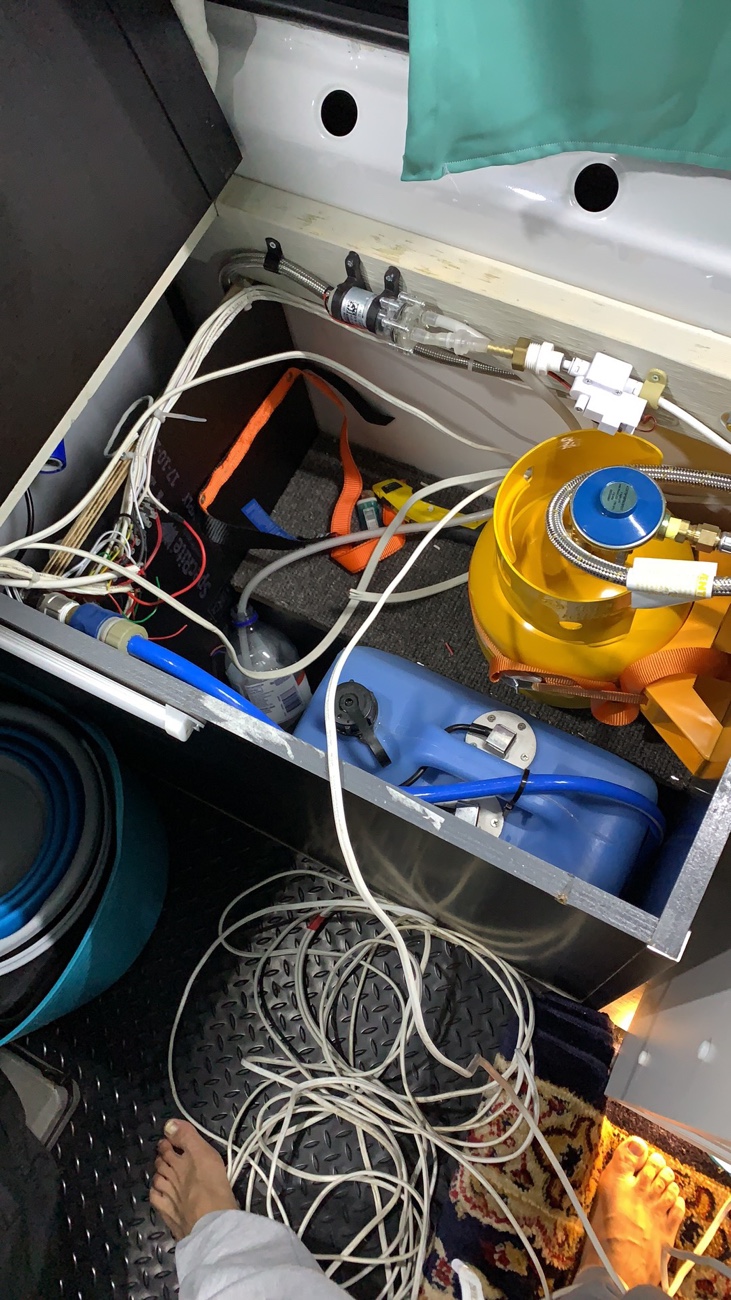 除了两个净水箱供水管路,还独立出一套饮用水管路,饮用水箱是当地连锁超市标准一次性10L饮用,喝完之后直接更换。