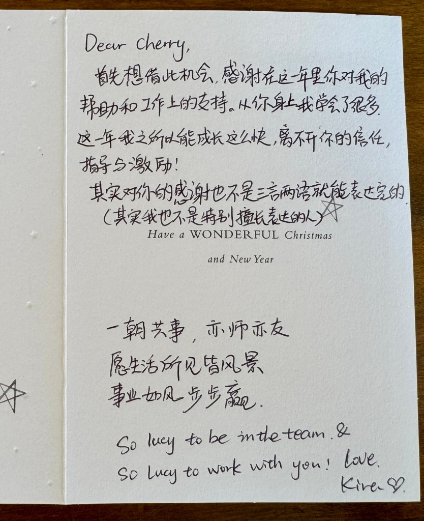 飞心是一位温柔的人。她不像我一样那么追求逻辑,但我们都明白,如果逻辑不奉献于真理,它就毫无价值。飞心从不把自己放在高于别人的位置,也不会利用半点权力去责难他人。相反,她借助自己的职位,去展现“宽恕”的真理。她看见每一个在她身边成长的人所散发的“爱”,并用宽恕与关怀维系着团队的氛围。